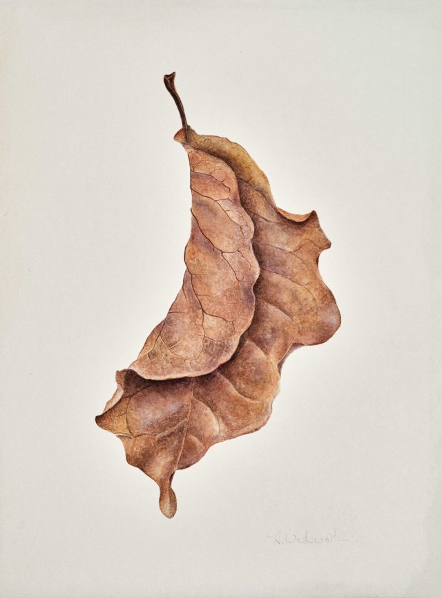 and oil to create detailed portraits of leaves and flowers. Landscapes, portraits, and still life continue to be occasional subjects.